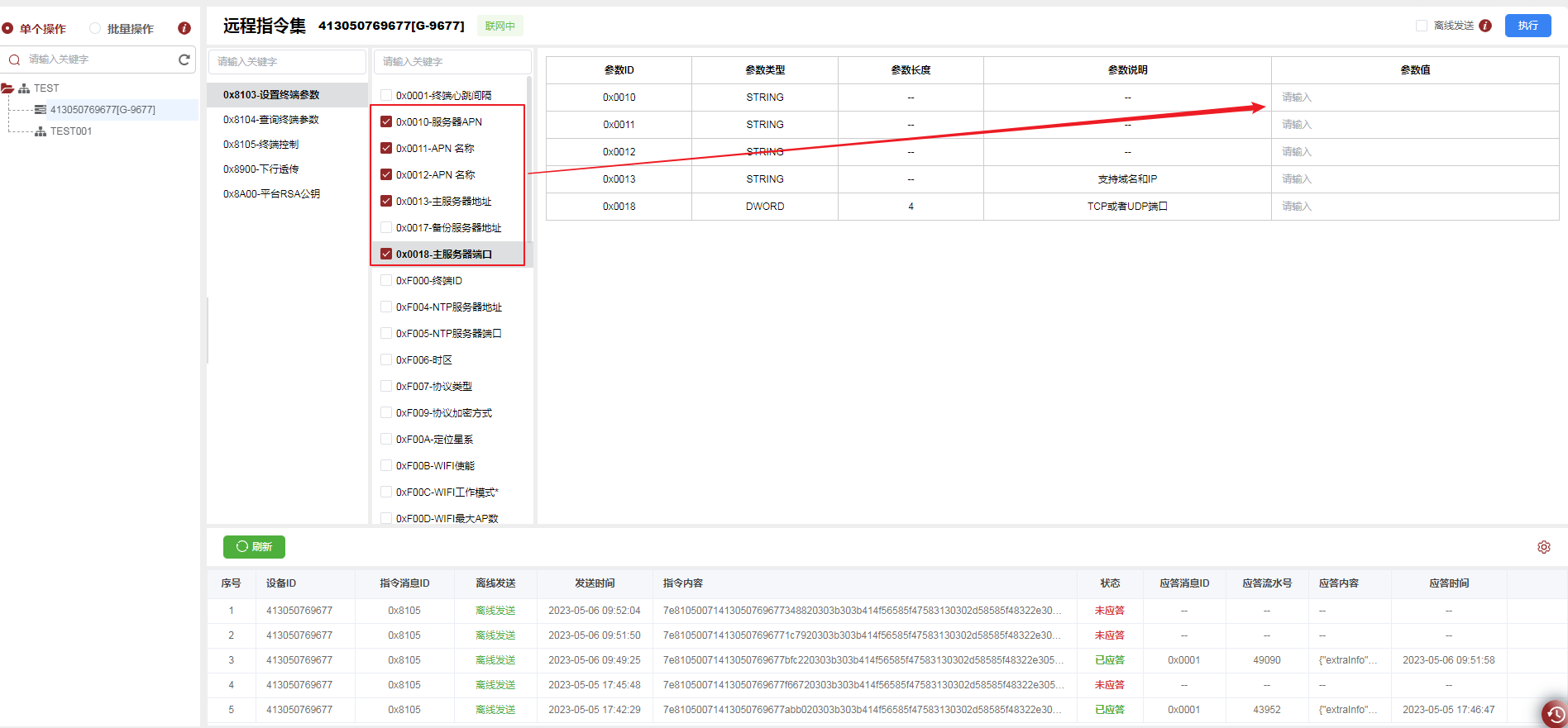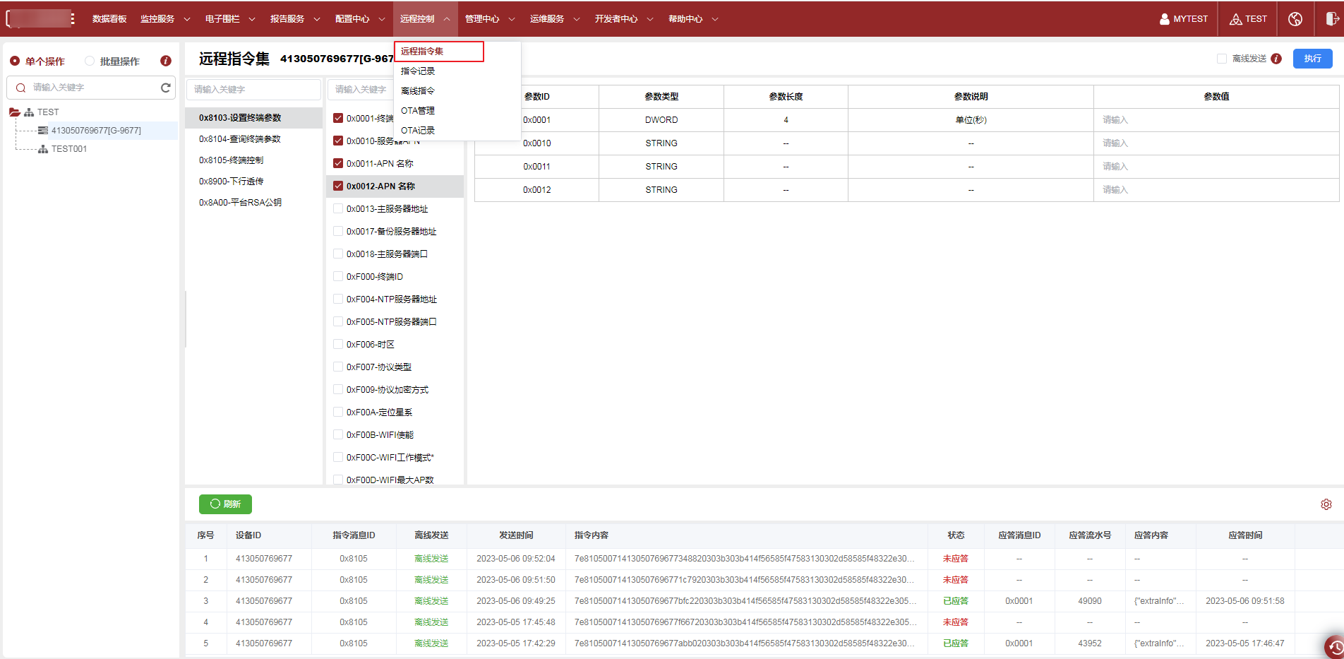选择设备后,系统会自动匹配设备可以操作的远程命令集合,选择自己想要下发的命令,填入命令所需要的参数即可进行远程命令下发