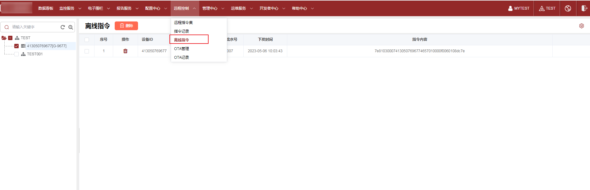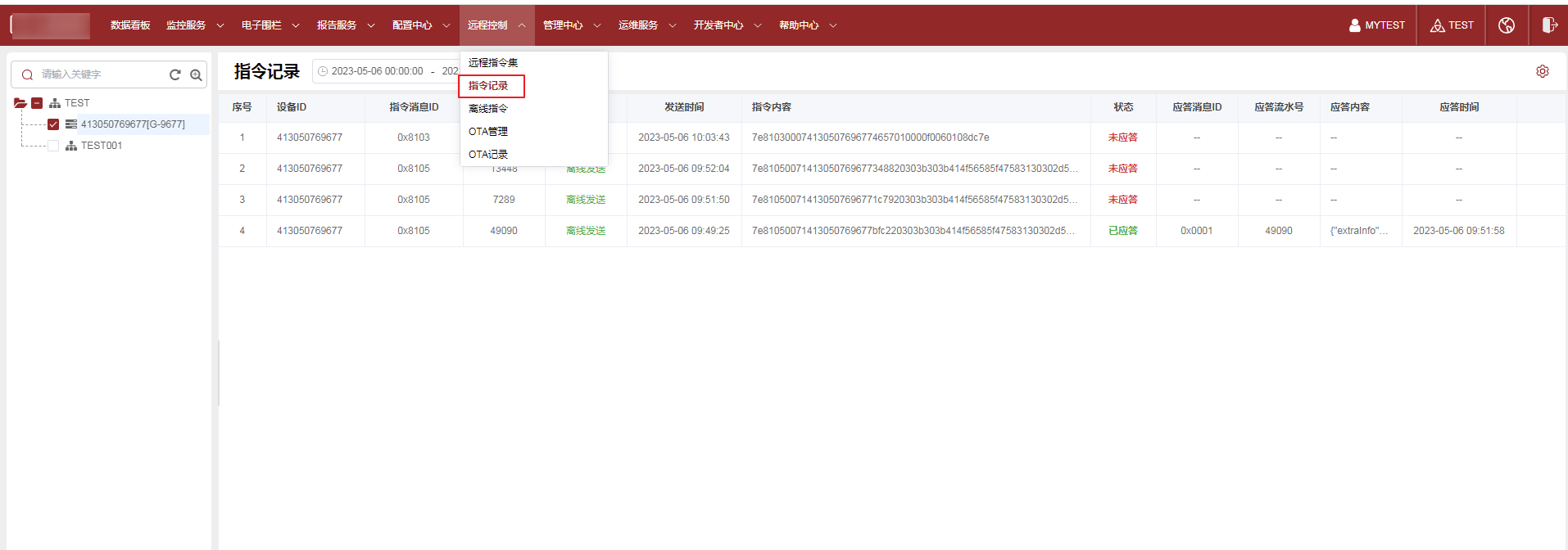 我们可以在指令记录查看设备的指令下发记录以及指令是否被应答的情况。