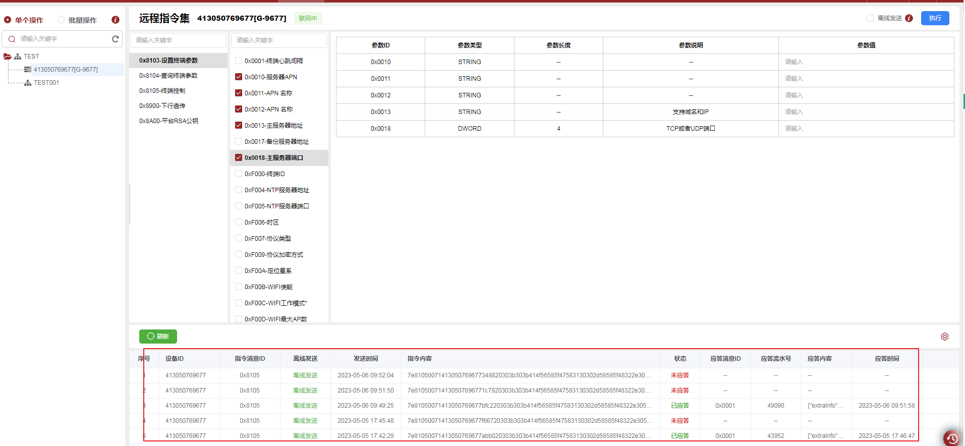在下面的列表框里可以呈现出当前远程命令操作记录与指令被设备应答的情况清单
