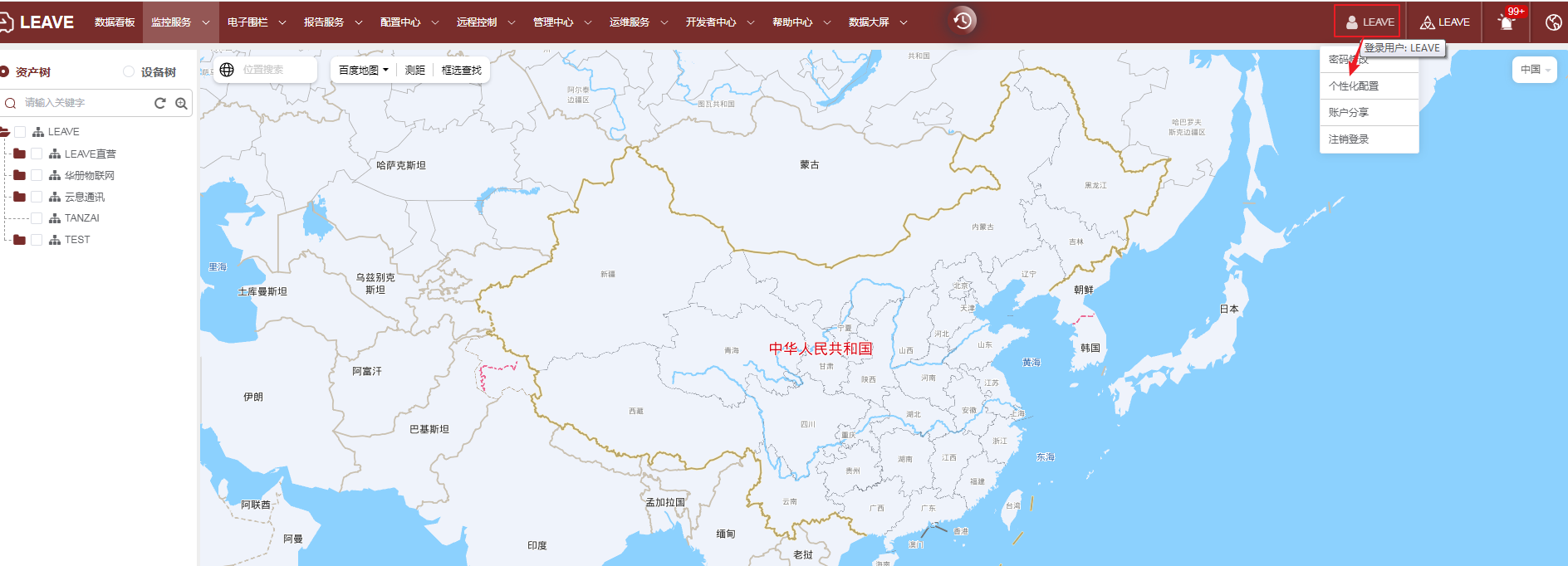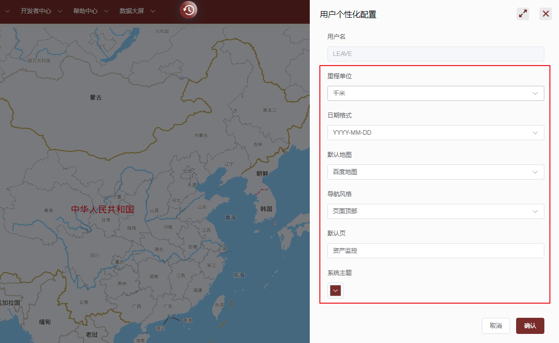 点击登录的账户,选择个性化设置用户可以根据自己的需要设置个性化呈现,包括:里程单位、日期格式、默认地图、功能导航栏风格、系统登录后默认打开的功能页面以及系统的主题颜色。作者:admin 创建时间:2023-05-28 22:03最后编辑:admin 更新时间:2024-04-27 11:42