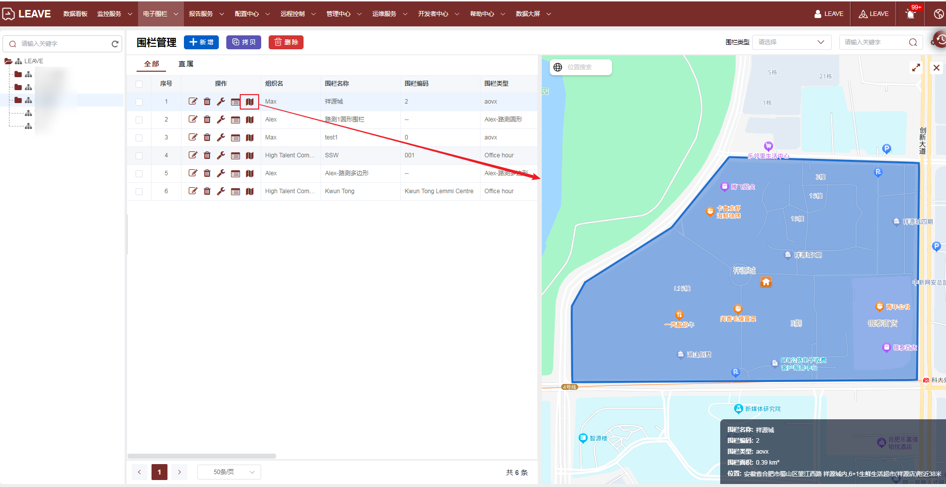 系统支持在线管理电子围栏,可以按组织、围栏类型与关键字筛选查询