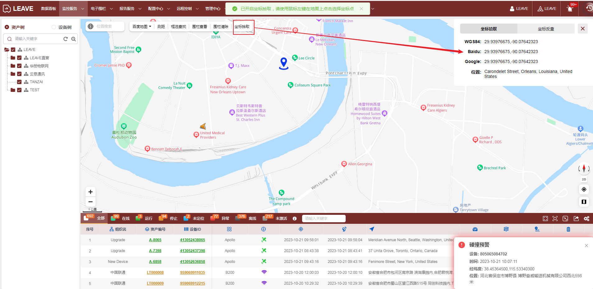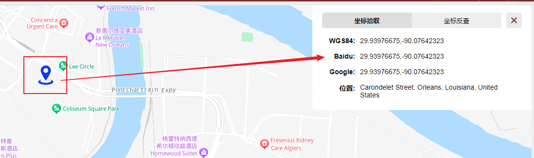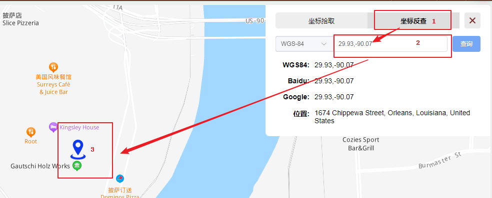 The coordinate inverse query is through the longitude and latitude points, and then click the query button to display the location of the longitude and latitude in the map.