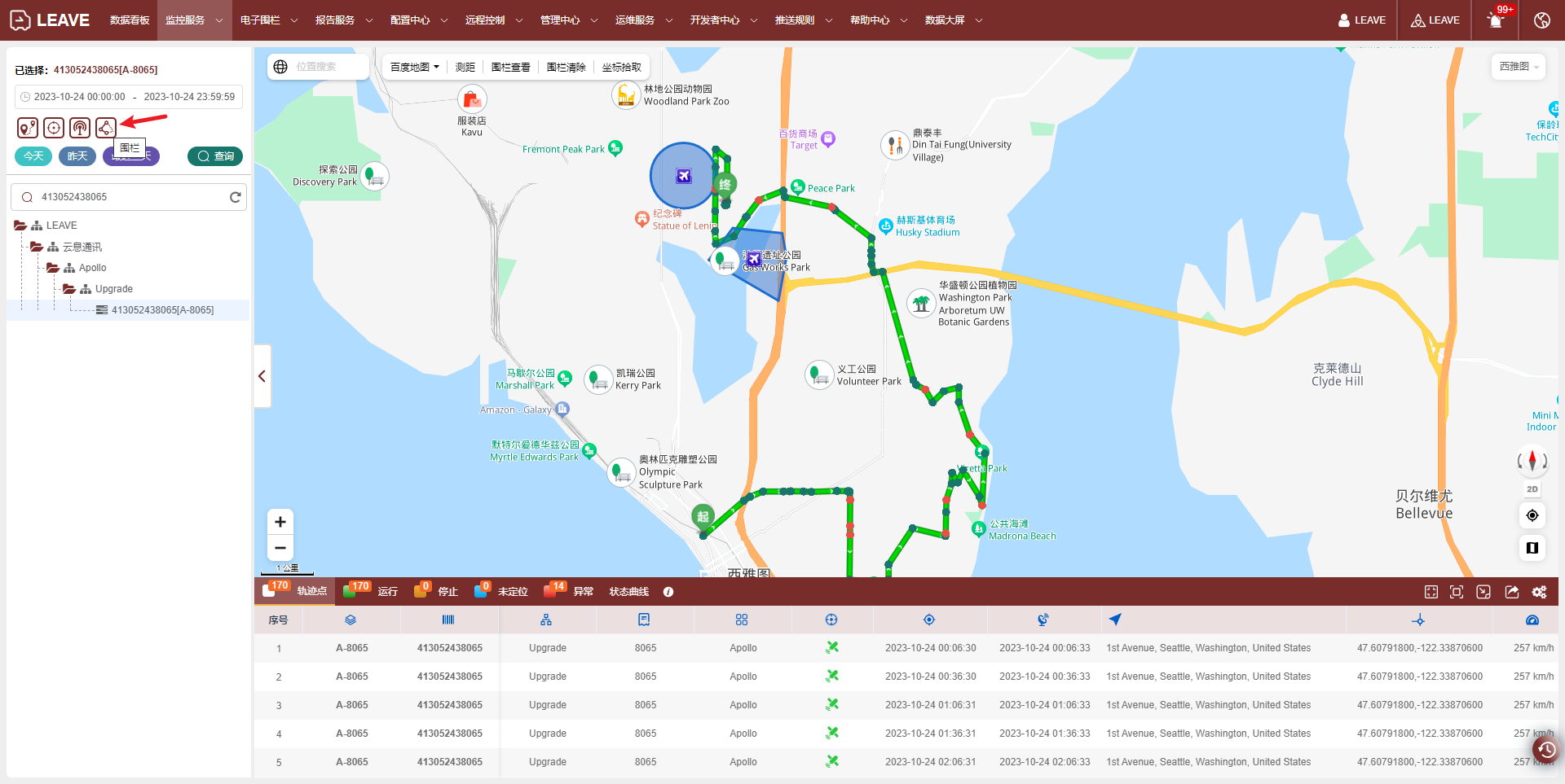 3.When querying the equipment track, the fence configured by the equipment will be displayed on the map by default