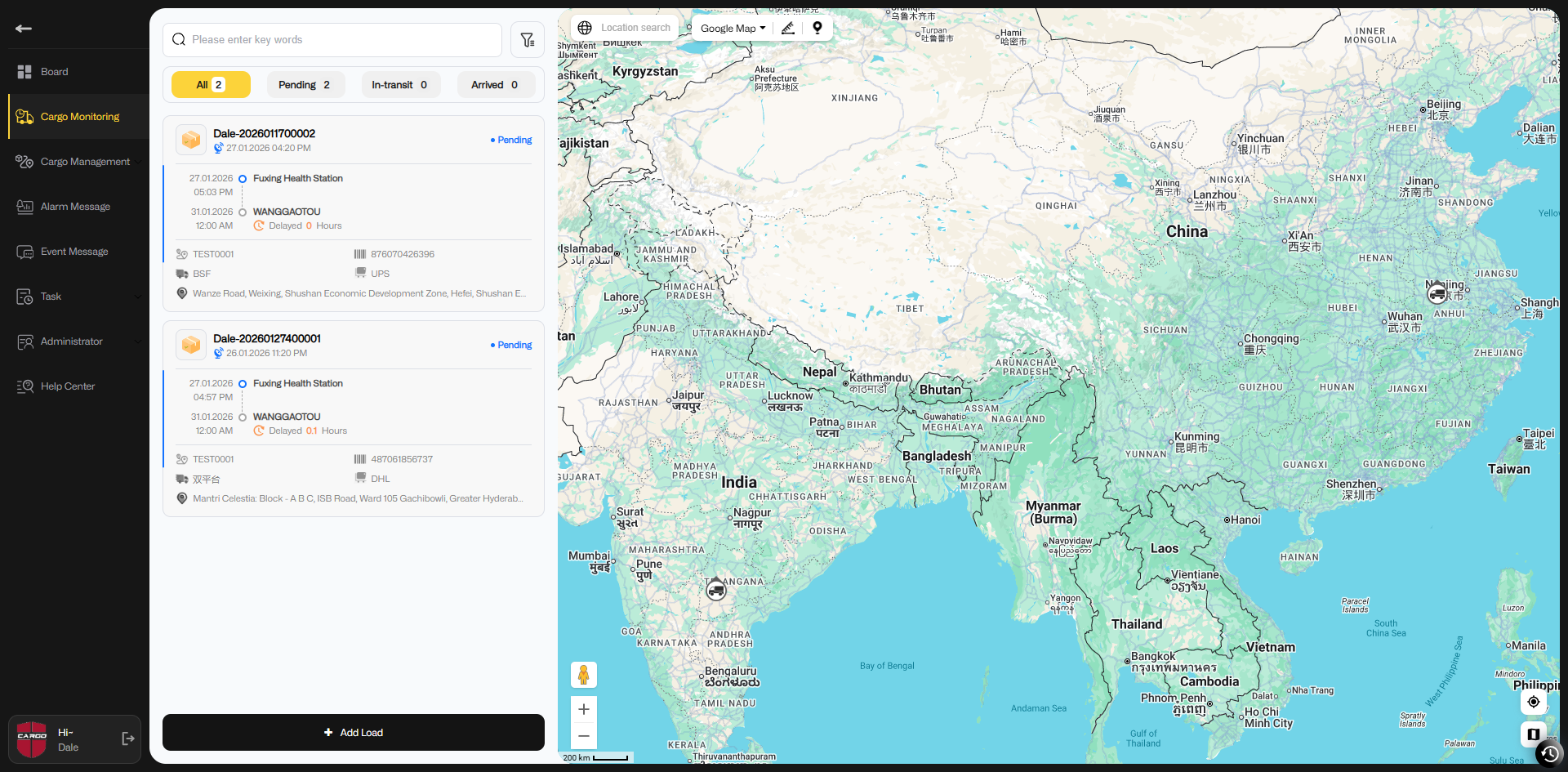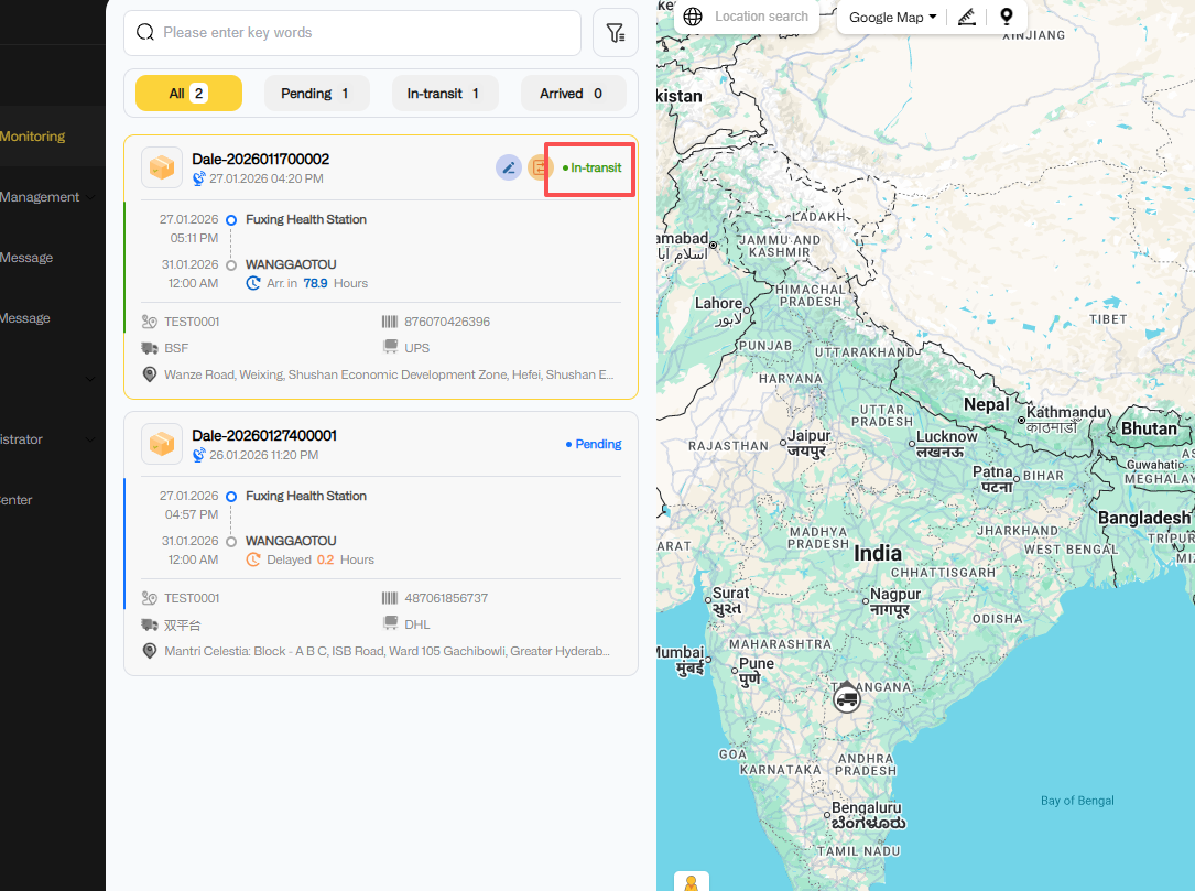 In this module, users can view the real-time location of the vehicles for the ongoing transportation tasks.