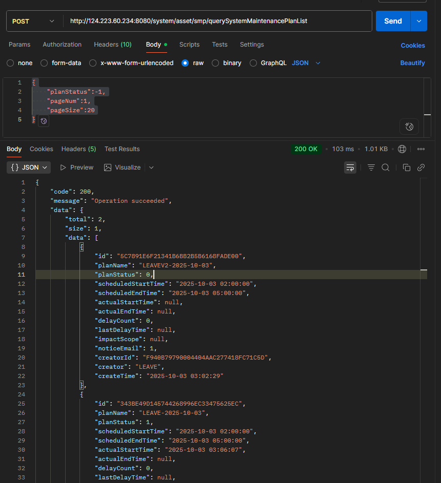 | planStatus | int | 维护计划状态(-1:全部;0 - 未开始 / 1 - 执行中 /2 - 已结束 / 3 - 已取消) | Y |