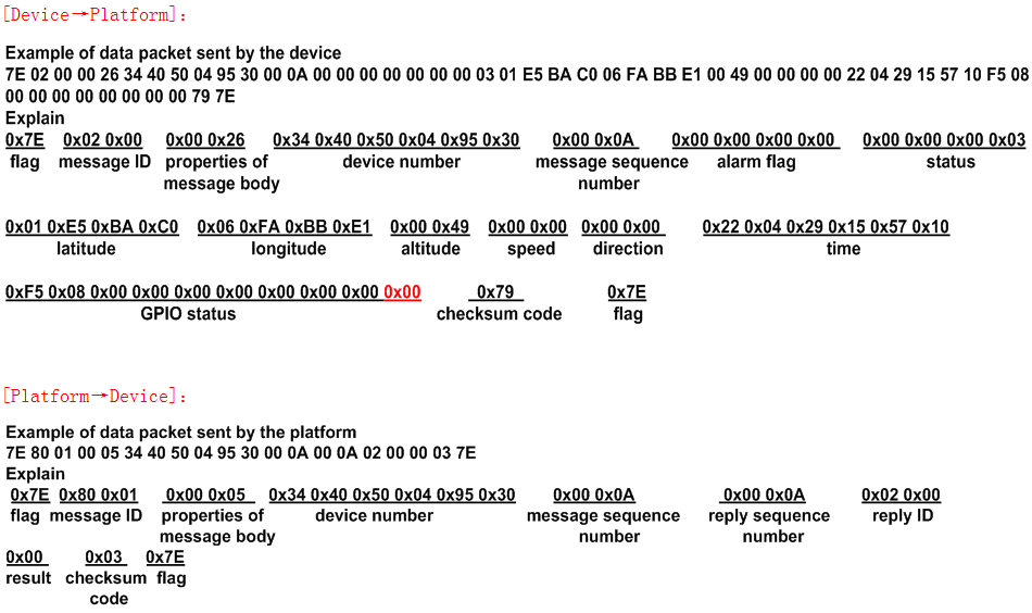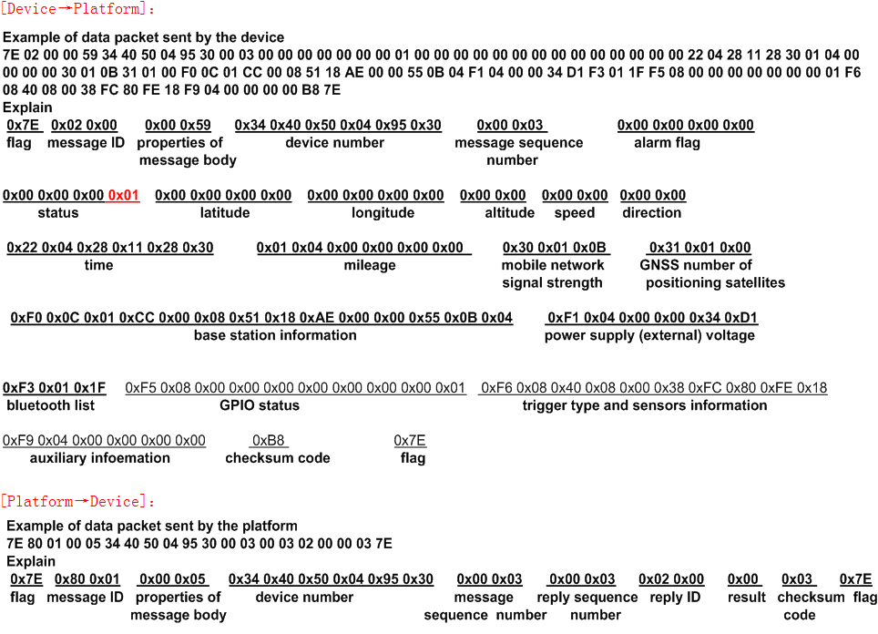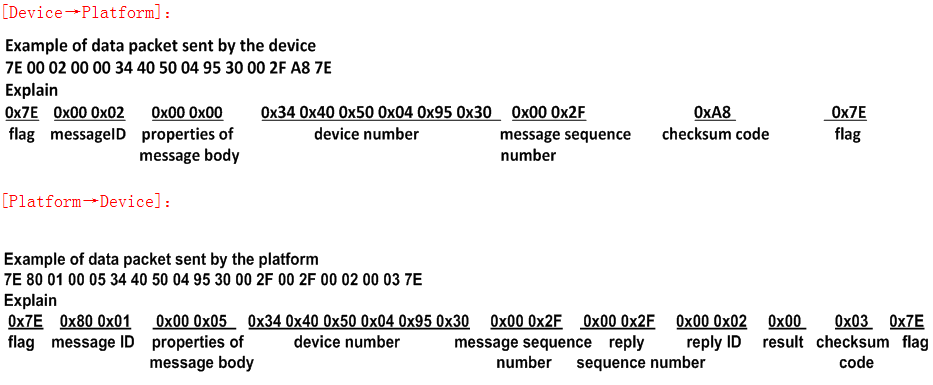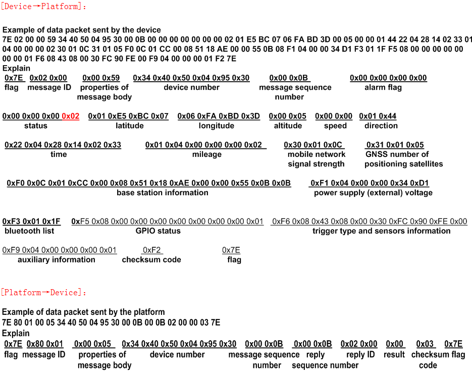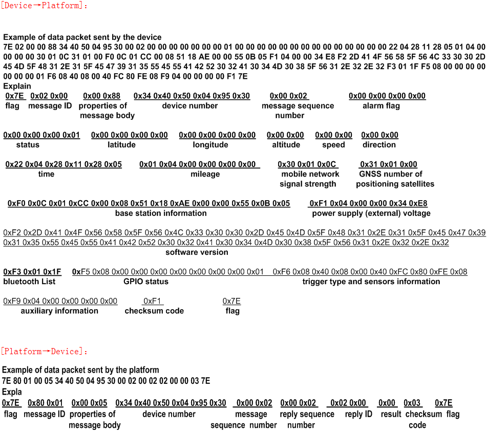 备注:设备完成注册和鉴权后,执行的第一次数据报文中包含软件版本号(ID=0xF2)信息,设备默认后续的数据报文中不包含软件版本号(ID=0xF2)信息,此信息可以通过配置实现每次数据报文中均包含。