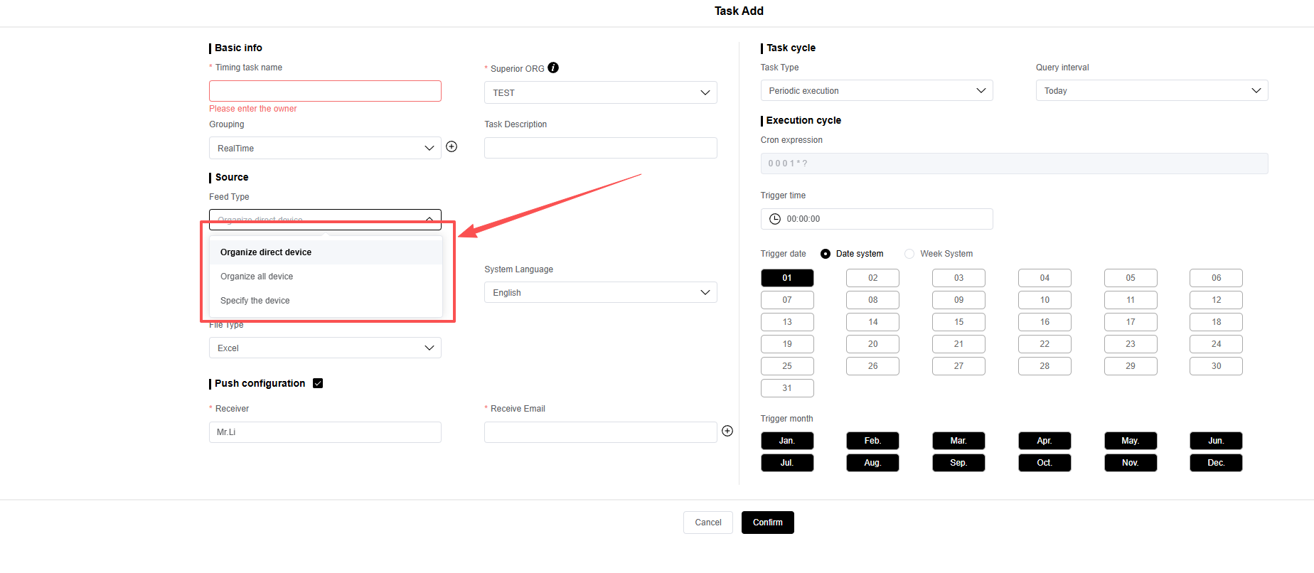在下图红框中你可以选择定时任务关联的设备清单。
