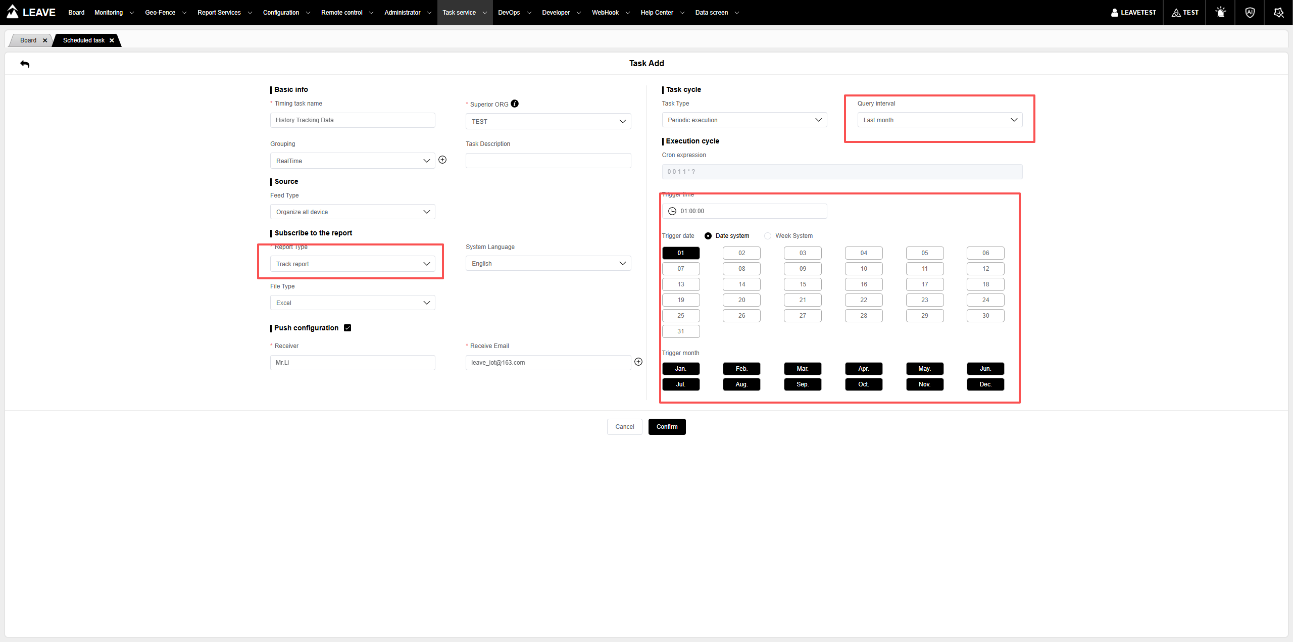(1)每个月的的1号将上个月所有的设备的轨迹进行备份到服务器。你只需要这样配置即可。