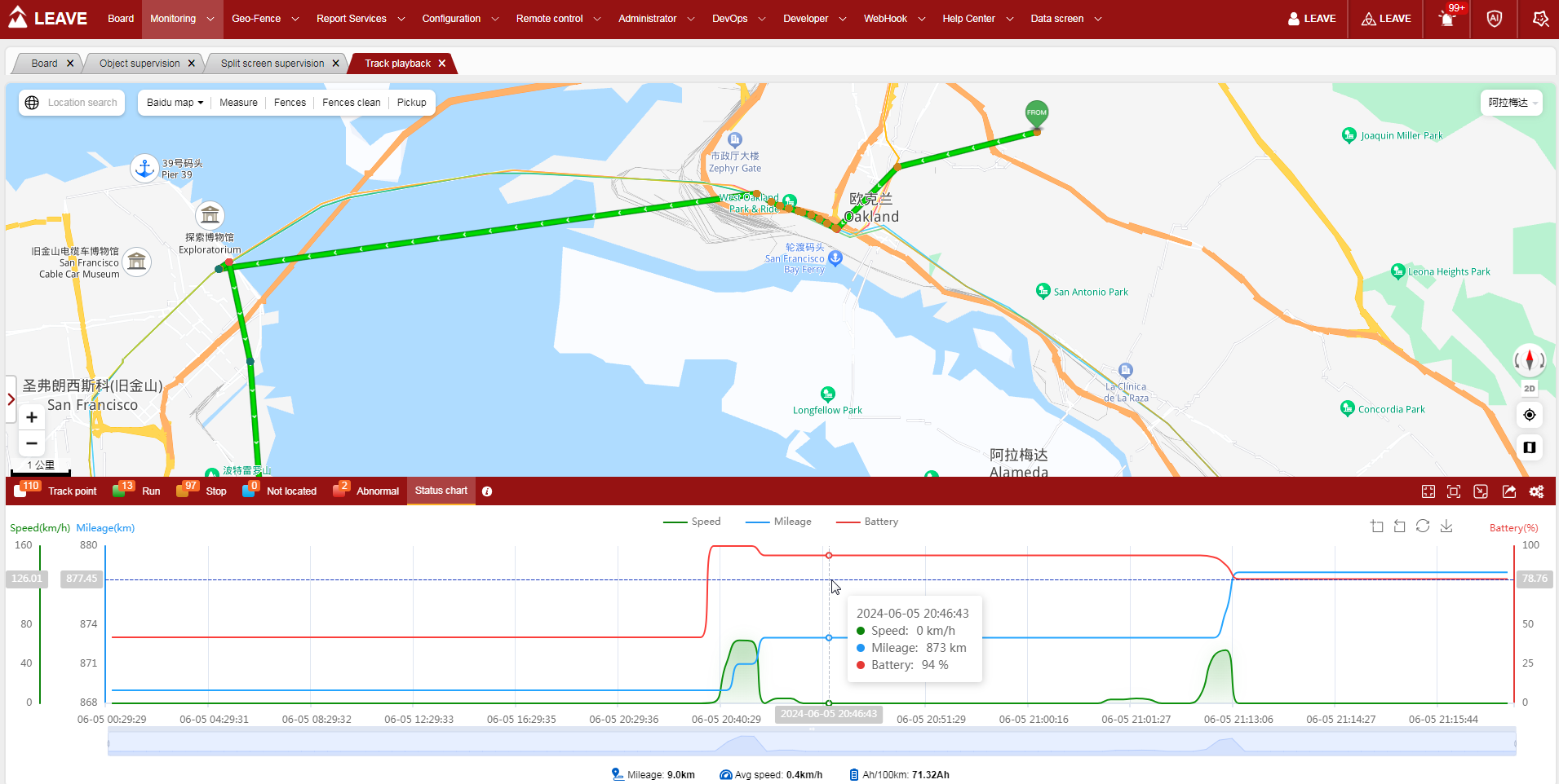 Contents Search Unfold 框架设计数据看板监控服务资产监控分屏监控轨迹回放视频监控视频回放电子围栏围栏管理围栏配置围栏类型报告服务AI 报警报警报告轨迹报告里程日历行驶报告停车报告联网报告温湿度曲线光照度曲线震动曲线电量曲线终端报文开关锁报告事件报告从机数据终端每小时轨迹量配置中心设备类型管理报警类型管理事件类型管理辅助定位接口配置远程控制远程指令集指令记录离线指令管理OTA管理OTA记录管理中心组织管理用户管理角色管理设备管理资产管理资产所属人分享管理MQTT账户管理运维服务终端异常登记资产异常登记系统运维基站维护WiFi维护系统操作日志用户注册审核开发者中心OpenApi个性化设置用户个性化配置公司个性化配置关闭与开启报警提醒报告列表字段的自定义呈现账户分享推送规则服务(WebHook)推送规则配置推送记录 No search results! Number of views:106 Document is Published by MinDoc 轨迹回放 利用轨迹回放可以查看资产的历史运行轨迹,并且会根据当时设备的运行状态与定位状态显示不同的轨迹点颜色。当点击某个点后,系统的右下角会将当前轨迹点的信息状态显示出来。可以根据设备的不同属性呈现不同的状态曲线作者:admin 创建时间:2023-06-16 14:17最后编辑:admin 更新时间:2024-06-06 18:12