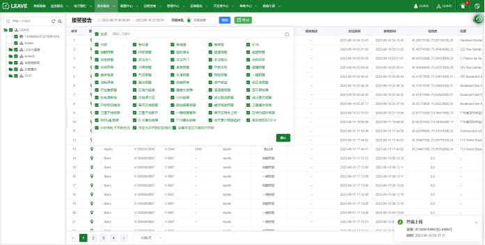 Contents Search Unfold 框架设计数据看板监控服务资产监控分屏监控轨迹回放视频监控视频回放电子围栏围栏管理围栏配置围栏类型报告服务AI 报警报警报告轨迹报告里程日历行驶报告停车报告联网报告温湿度曲线光照度曲线震动曲线电量曲线终端报文开关锁报告事件报告从机数据终端每小时轨迹量配置中心设备类型管理报警类型管理事件类型管理辅助定位接口配置远程控制远程指令集指令记录离线指令管理OTA管理OTA记录管理中心组织管理用户管理角色管理设备管理资产管理资产所属人分享管理MQTT账户管理运维服务终端异常登记资产异常登记系统运维基站维护WiFi维护系统操作日志用户注册审核开发者中心OpenApi个性化设置用户个性化配置公司个性化配置关闭与开启报警提醒报告列表字段的自定义呈现账户分享推送规则服务(WebHook)推送规则配置推送记录 No search results! Number of views:113 Document is Published by MinDoc 报警报告 可以查看指定设备、指定时间段、指定类型的报警信息报告支持导出到Excel与PDF作者:admin 创建时间:2023-06-16 14:18最后编辑:admin 更新时间:2024-06-06 18:12