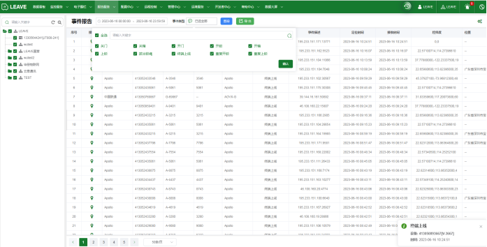 Contents Search Unfold 框架设计数据看板监控服务资产监控分屏监控轨迹回放视频监控视频回放电子围栏围栏管理围栏配置围栏类型报告服务AI 报警报警报告轨迹报告里程日历行驶报告停车报告联网报告温湿度曲线光照度曲线震动曲线电量曲线终端报文开关锁报告事件报告从机数据终端每小时轨迹量配置中心设备类型管理报警类型管理事件类型管理辅助定位接口配置远程控制远程指令集指令记录离线指令管理OTA管理OTA记录管理中心组织管理用户管理角色管理设备管理资产管理资产所属人分享管理MQTT账户管理运维服务终端异常登记资产异常登记系统运维基站维护WiFi维护系统操作日志用户注册审核开发者中心OpenApi个性化设置用户个性化配置公司个性化配置关闭与开启报警提醒报告列表字段的自定义呈现账户分享推送规则服务(WebHook)推送规则配置推送记录 No search results! Number of views:65 Document is Published by MinDoc 事件报告 查看某个设备最近一段时间的事件数据,报告支持导出到Excel与PDF。作者:admin 创建时间:2023-06-16 14:24最后编辑:admin 更新时间:2024-06-06 18:12