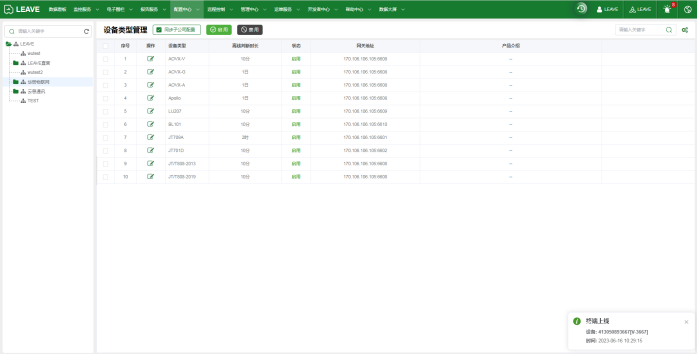 Contents Search Unfold 框架设计数据看板监控服务资产监控分屏监控轨迹回放视频监控视频回放电子围栏围栏管理围栏配置围栏类型报告服务AI 报警报警报告轨迹报告里程日历行驶报告停车报告联网报告温湿度曲线光照度曲线震动曲线电量曲线终端报文开关锁报告事件报告从机数据终端每小时轨迹量配置中心设备类型管理报警类型管理事件类型管理辅助定位接口配置远程控制远程指令集指令记录离线指令管理OTA管理OTA记录管理中心组织管理用户管理角色管理设备管理资产管理资产所属人分享管理MQTT账户管理运维服务终端异常登记资产异常登记系统运维基站维护WiFi维护系统操作日志用户注册审核开发者中心OpenApi个性化设置用户个性化配置公司个性化配置关闭与开启报警提醒报告列表字段的自定义呈现账户分享推送规则服务(WebHook)推送规则配置推送记录 No search results! Number of views:115 Document is Published by MinDoc 设备类型管理 在设备类型管理里面可以设置设备类型的状态是否使用,如果不使用的话在注册设备的时候不会显示这个类型,并且支持给设备外链一个连接用户可以查看设备的外链介绍或者性能参数等等。可以对资产监控下面的设备快捷功能键进行自定义。如果去掉勾选,则在资产监控的弹框下面不会显示此功能的按钮。作者:admin 创建时间:2023-06-16 14:30最后编辑:admin 更新时间:2024-06-06 18:12