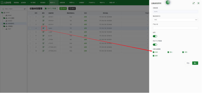 在设备类型管理里面可以设置设备类型的状态是否使用,如果不使用的话在注册设备的时候不会显示这个类型,并且支持给设备外链一个连接用户可以查看设备的外链介绍或者性能参数等等。可以对资产监控下面的设备快捷功能键进行自定义。如果去掉勾选,则在资产监控的弹框下面不会显示此功能的按钮。作者:admin 创建时间:2023-06-16 14:30最后编辑:admin 更新时间:2024-06-06 18:12
