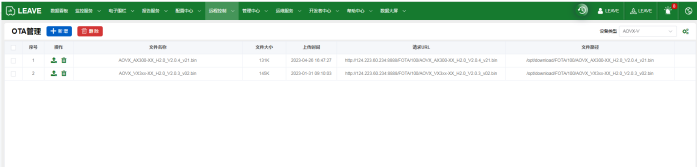 Contents Search Unfold 框架设计数据看板监控服务资产监控分屏监控轨迹回放视频监控视频回放电子围栏围栏管理围栏配置围栏类型报告服务AI 报警报警报告轨迹报告里程日历行驶报告停车报告联网报告温湿度曲线光照度曲线震动曲线电量曲线终端报文开关锁报告事件报告从机数据终端每小时轨迹量配置中心设备类型管理报警类型管理事件类型管理辅助定位接口配置远程控制远程指令集指令记录离线指令管理OTA管理OTA记录管理中心组织管理用户管理角色管理设备管理资产管理资产所属人分享管理MQTT账户管理运维服务终端异常登记资产异常登记系统运维基站维护WiFi维护系统操作日志用户注册审核开发者中心OpenApi个性化设置用户个性化配置公司个性化配置关闭与开启报警提醒报告列表字段的自定义呈现账户分享推送规则服务(WebHook)推送规则配置推送记录 No search results! Number of views:132 Document is Published by MinDoc OTA管理 需要设备支持FOTA才能使用,对FOTA固件信息进行管理,系统支持上传与删除固件版本并且可以指定固件版本对设备进行升级。作者:admin 创建时间:2023-06-16 14:34最后编辑:admin 更新时间:2024-06-06 18:12