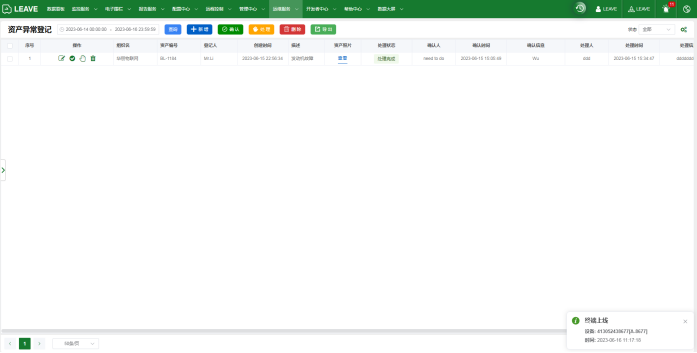 Contents Search Unfold 框架设计数据看板监控服务资产监控分屏监控轨迹回放视频监控视频回放电子围栏围栏管理围栏配置围栏类型报告服务AI 报警报警报告轨迹报告里程日历行驶报告停车报告联网报告温湿度曲线光照度曲线震动曲线电量曲线终端报文开关锁报告事件报告从机数据终端每小时轨迹量配置中心设备类型管理报警类型管理事件类型管理辅助定位接口配置远程控制远程指令集指令记录离线指令管理OTA管理OTA记录管理中心组织管理用户管理角色管理设备管理资产管理资产所属人分享管理MQTT账户管理运维服务终端异常登记资产异常登记系统运维基站维护WiFi维护系统操作日志用户注册审核开发者中心OpenApi个性化设置用户个性化配置公司个性化配置关闭与开启报警提醒报告列表字段的自定义呈现账户分享推送规则服务(WebHook)推送规则配置推送记录 No search results! Number of views:68 Document is Published by MinDoc 资产异常登记 对异常的资产进行信息登记,并记录处理的过程。作者:admin 创建时间:2023-06-16 14:38最后编辑:admin 更新时间:2024-06-06 18:12