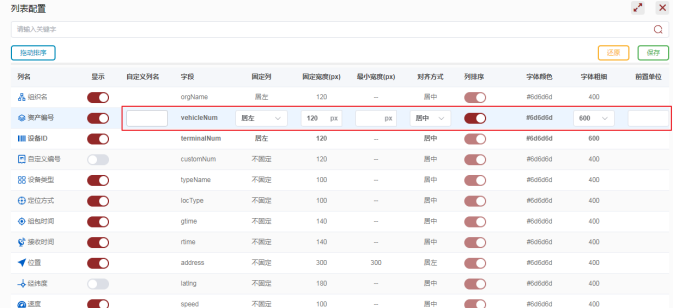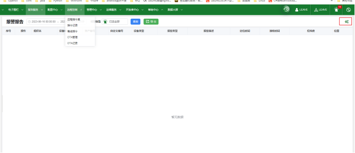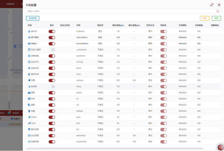 Contents Search Unfold 框架设计数据看板监控服务资产监控分屏监控轨迹回放视频监控视频回放电子围栏围栏管理围栏配置围栏类型报告服务AI 报警报警报告轨迹报告里程日历行驶报告停车报告联网报告温湿度曲线光照度曲线震动曲线电量曲线终端报文开关锁报告事件报告从机数据终端每小时轨迹量配置中心设备类型管理报警类型管理事件类型管理辅助定位接口配置远程控制远程指令集指令记录离线指令管理OTA管理OTA记录管理中心组织管理用户管理角色管理设备管理资产管理资产所属人分享管理MQTT账户管理运维服务终端异常登记资产异常登记系统运维基站维护WiFi维护系统操作日志用户注册审核开发者中心OpenApi个性化设置用户个性化配置公司个性化配置关闭与开启报警提醒报告列表字段的自定义呈现账户分享推送规则服务(WebHook)推送规则配置推送记录 No search results! Number of views:94 Document is Published by MinDoc 报告列表字段的自定义呈现 所有的报告或者列表呈现的地方只要右侧有此图标就可以对显示的字段进行自定义点击之后弹出自定义面板我们可以通过“拖动排序”对列表显示的字段进行排序,也可以点击某一栏对这一栏是的标题名称、是否显示、宽度、字体样式、是否显示进行自定义。拖动排序:自定义显示样式:作者:admin 创建时间:2023-06-16 14:43最后编辑:admin 更新时间:2024-06-06 18:12