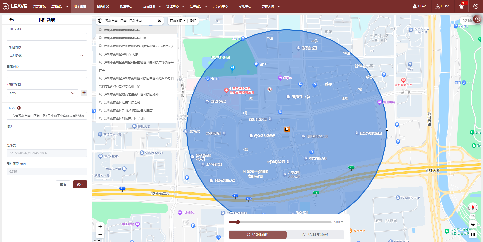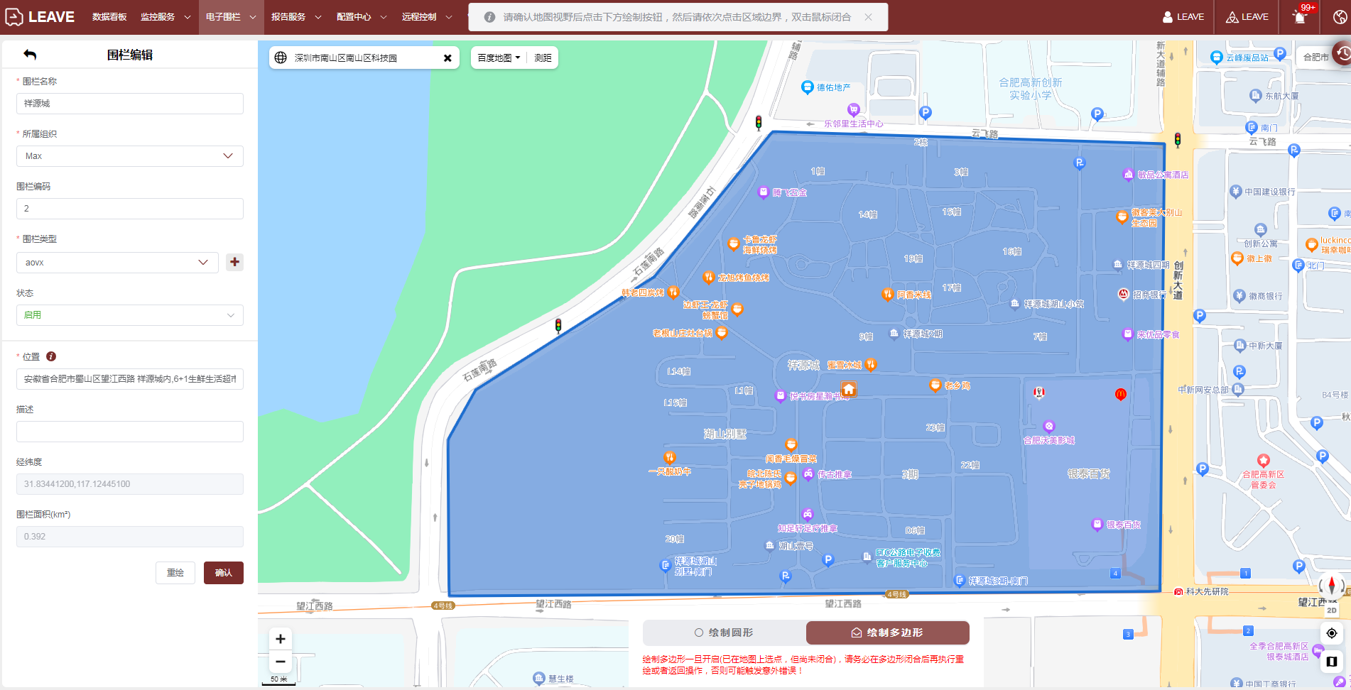 围栏支持按圆形围栏以及多边形围栏进行规划,可以搜索位置进行快速规划围栏