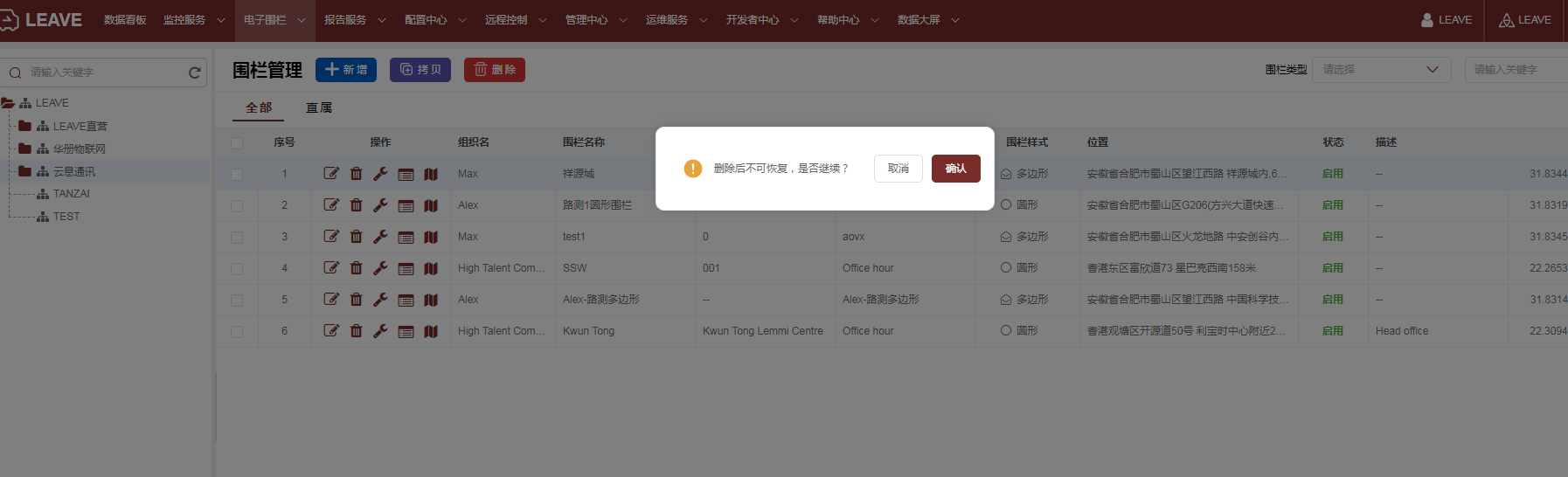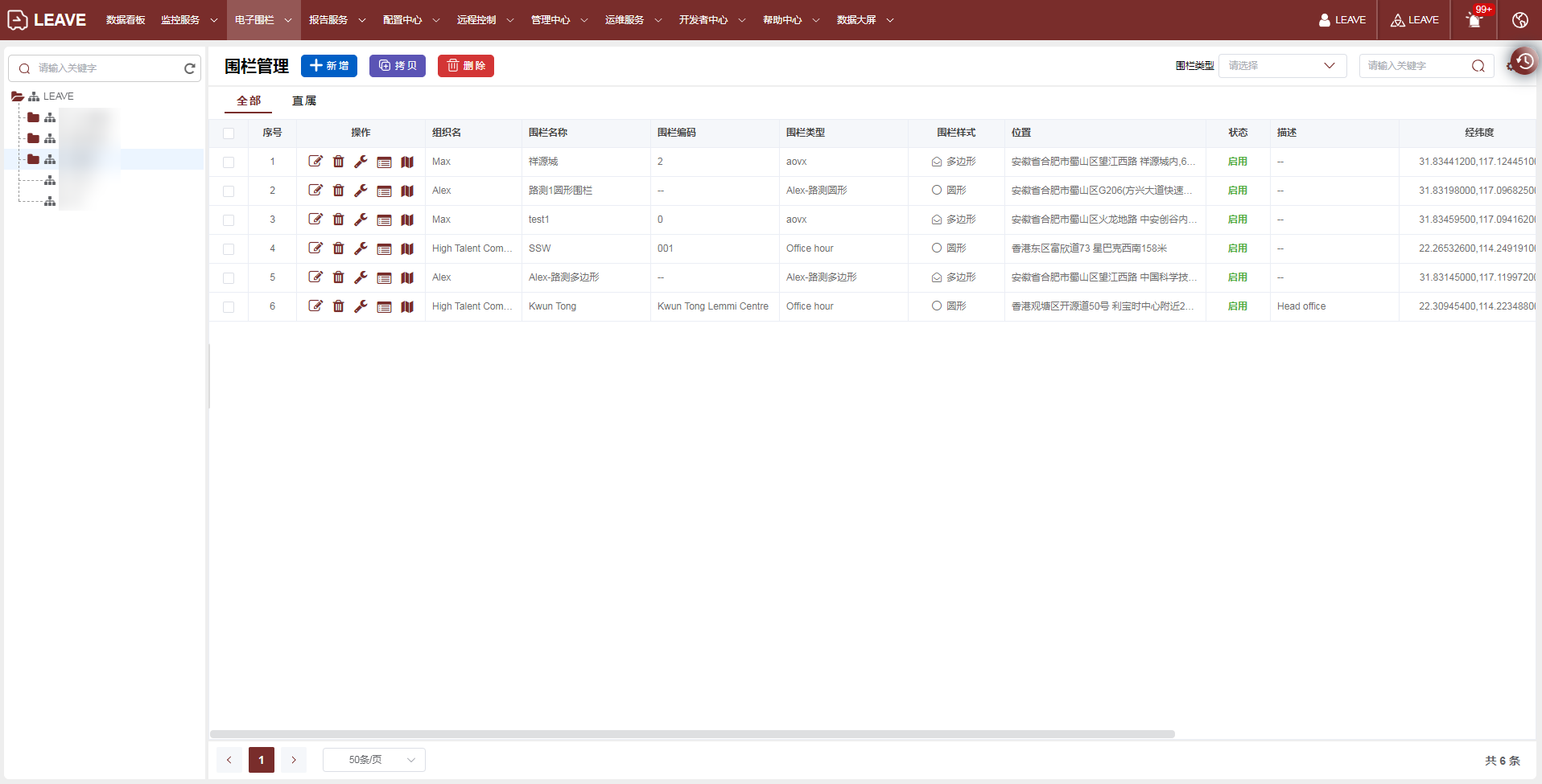 系统支持在线管理电子围栏,可以按组织、围栏类型与关键字筛选查询