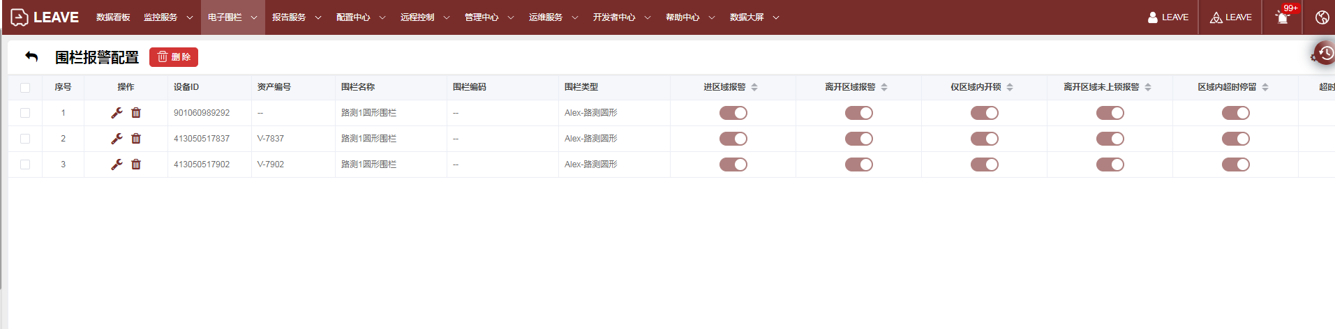 针对围栏进行设备配置,可以配置进出围栏报警、围栏超时停留、围栏区域内超速,以及资产安全管控的设备区域开锁限制等。