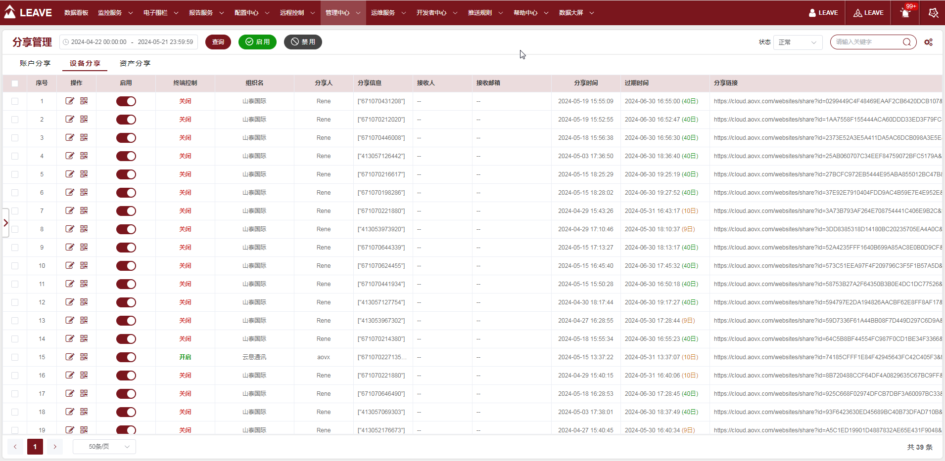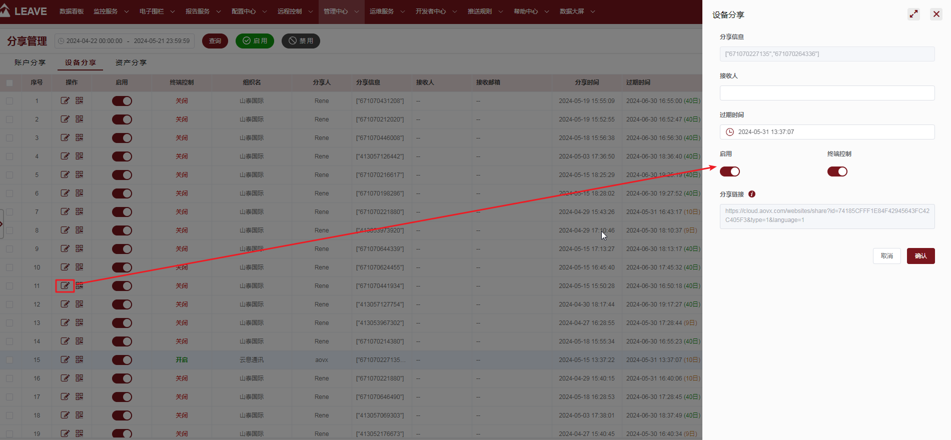 Contents Search Unfold 框架设计数据看板监控服务资产监控分屏监控轨迹回放视频监控视频回放电子围栏围栏管理围栏配置围栏类型报告服务AI 报警报警报告轨迹报告里程日历行驶报告停车报告联网报告温湿度曲线光照度曲线震动曲线电量曲线终端报文开关锁报告事件报告从机数据终端每小时轨迹量配置中心设备类型管理报警类型管理事件类型管理辅助定位接口配置远程控制远程指令集指令记录离线指令管理OTA管理OTA记录管理中心组织管理用户管理角色管理设备管理资产管理资产所属人分享管理MQTT账户管理运维服务终端异常登记资产异常登记系统运维基站维护WiFi维护系统操作日志用户注册审核开发者中心OpenApi个性化设置用户个性化配置公司个性化配置关闭与开启报警提醒报告列表字段的自定义呈现账户分享推送规则服务(WebHook)推送规则配置推送记录 No search results! Number of views:84 Document is Published by MinDoc 分享管理 用来管理分享给用户的链接可以修改分享信息查看分享二维码启用/禁用此次分享作者:admin 创建时间:2024-05-21 11:31最后编辑:admin 更新时间:2024-06-06 18:12
